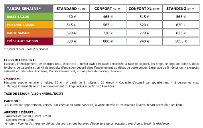![]() ![]() Tarif "Cure"* De 21 nuitées à 90 nuitées Tarif "Semaine"* 7 nuitées à 20 nuitées Tarif "Nuitée"* ** 2 à 6 nuitées * Arrivée tous les jours sauf le dimanche ** Pour les courts séjours, réservation possible uniquement moins d'un mois avant votre arrivée - Tarifs applicables par nuitée avec un minimum de 2 nuitées ![]() BASSE SAISON : Du 08/03/2025 au 30/04/25 et du 01/11/25 au 01/12/25 MOYENNE SAISON : Du 01/05/25 au 31/05/25 et du 01/10/25 au 31/10/25 HAUTE SAISON : Du 01/06/25 au 04/07/25 et du 23/08/25 au 30/09/25 TRES HAUTE SAISON : Du 05/07/25 au 22/08/25 ![]() ![]() ![]() |
